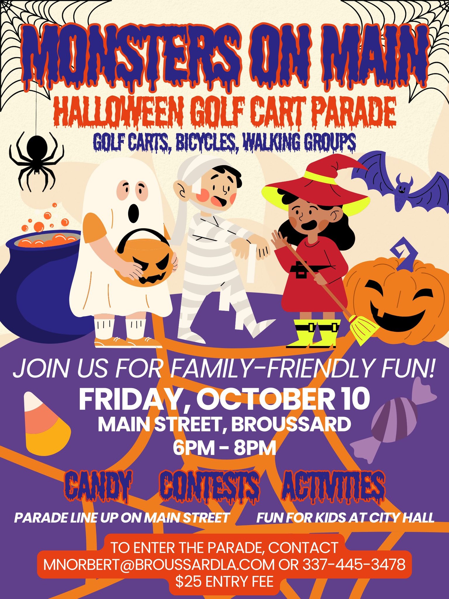 🎃Bring the kids to Broussard for some Halloween fun at Monsters on Main, Friday, October 10, from 6 p.m. to 8 p.m.! We will have a golf cart, bicycle, and walking groups parade down Main Street to Broussard City Hall! There will be lots of 🍬candy, contests, and activities! It’s going to be a spooky good time for the whole family! 👻 $25 parade entry fee (single golf carts, bicycles, or walking groups). To enter the parade, contact mnorbert@broussardla.com or 337-445-3478.